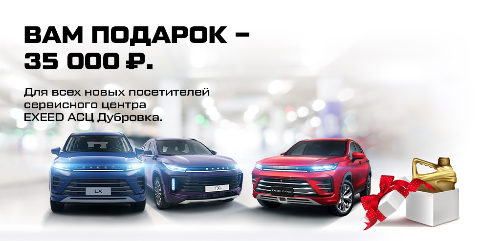 ВАС ЖДЕТ ПОДАРОЧНЫЙ СЕРТИФИКАТ НА 35 000 ₽ ПРИ ЗАПИСИ НА ТО И РЕМОНТ EXEED В АВТОСПЕЦЦЕНТР ДУБРОВКА .